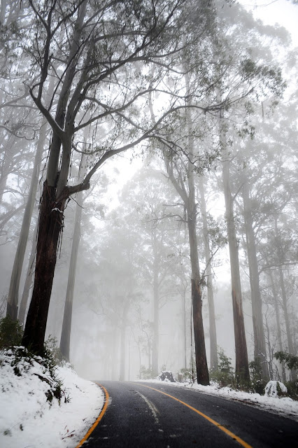 Enormous sky scraper trees loom over the road for miles, lush fern filled bush spills from the sides and the road winds and cuts through the forest like a theme-park ride. After driving from bush, into mist, into deep fog, we suddenly emerged into snow! I actually felt my face erupt into a huge smile and I begged to stop the car, I hadn't seen snow in 3 years! We ended up over 1000meters above sea level at the top and the car thermostat told us it was a freezing 1 degree! Just like home, and just what I needed.